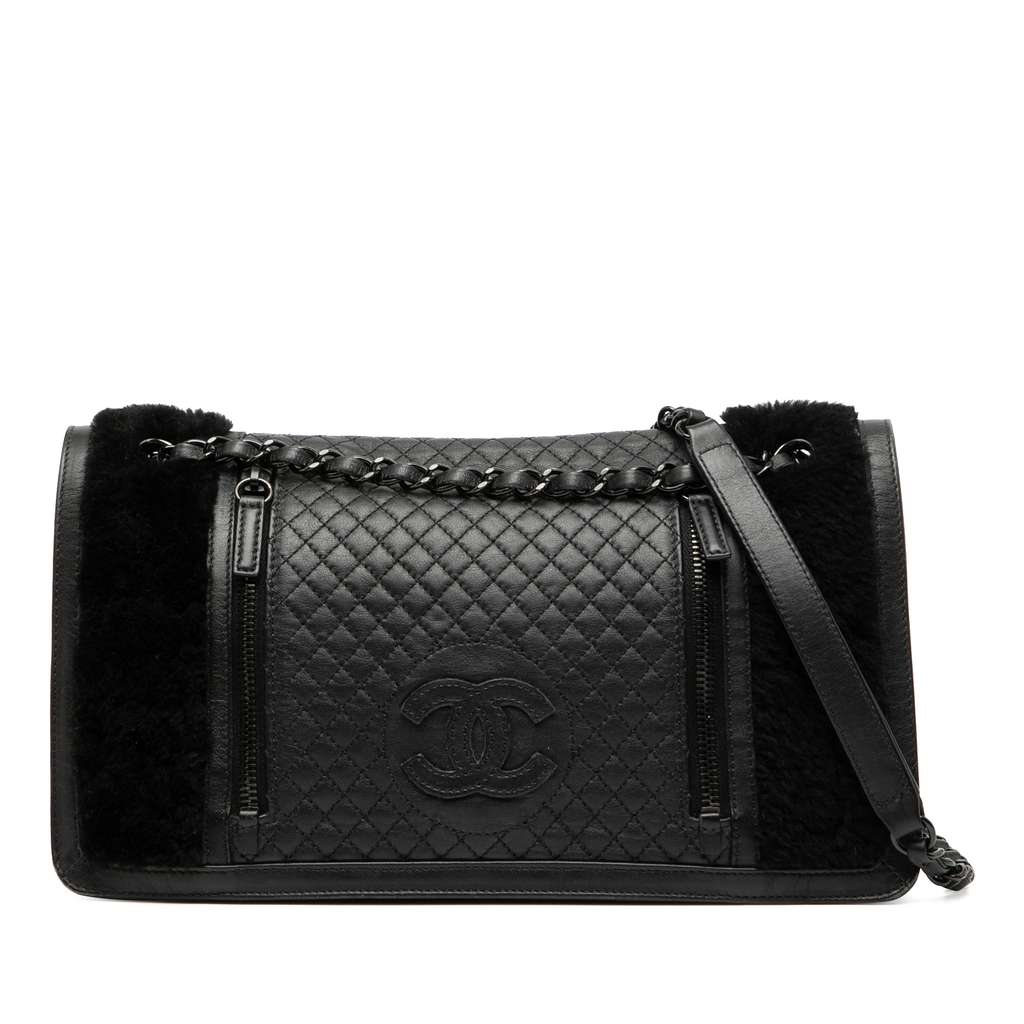 This shoulder bag features a lambskin and fur body, a chain link strap with leather shoulder guard, a front flap with magnetic snap closure, and interior zip and slip pockets.