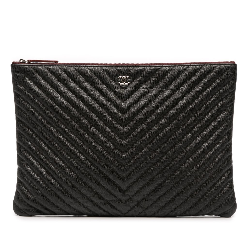 This clutch bag features a chevron leather body, a top zip closure, an exterior back slip pocket, and an interior zip pocket.