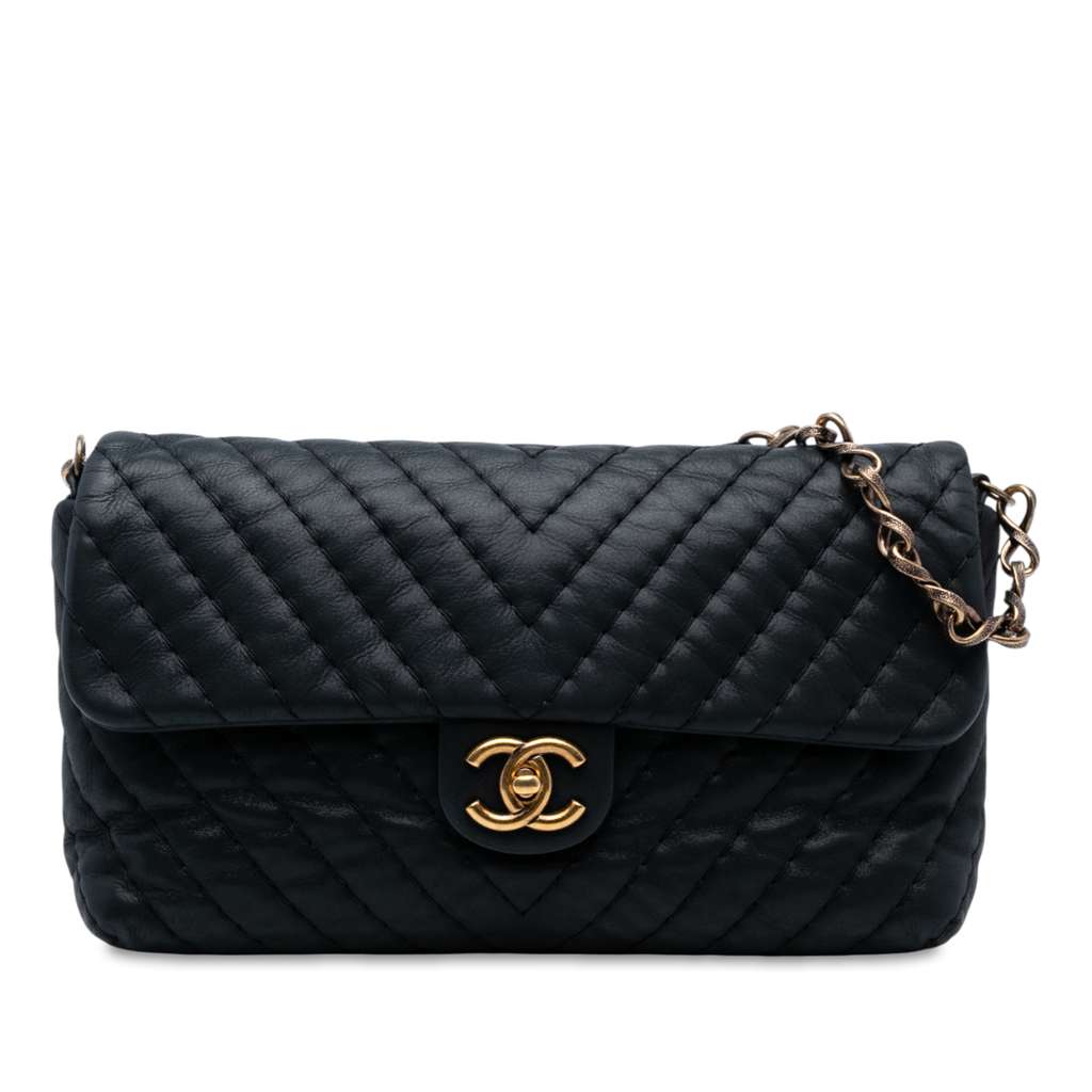 This shoulder bag features a quilted iridescent leather body, a gold-tone chain strap with leather guard, a front flap with interlocking Cs and twist lock closure, and an interior zip pocket.