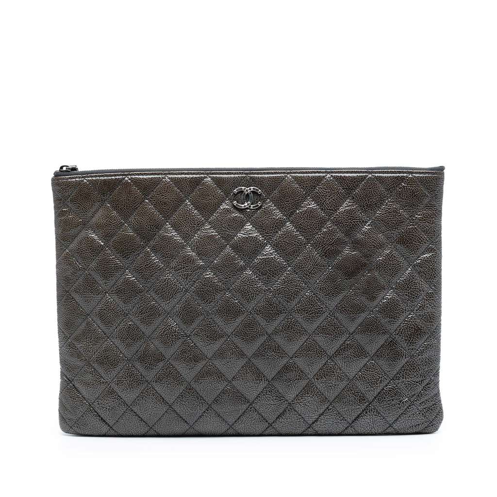This clutch bag features a quilted patent leather body and a top zip closure.