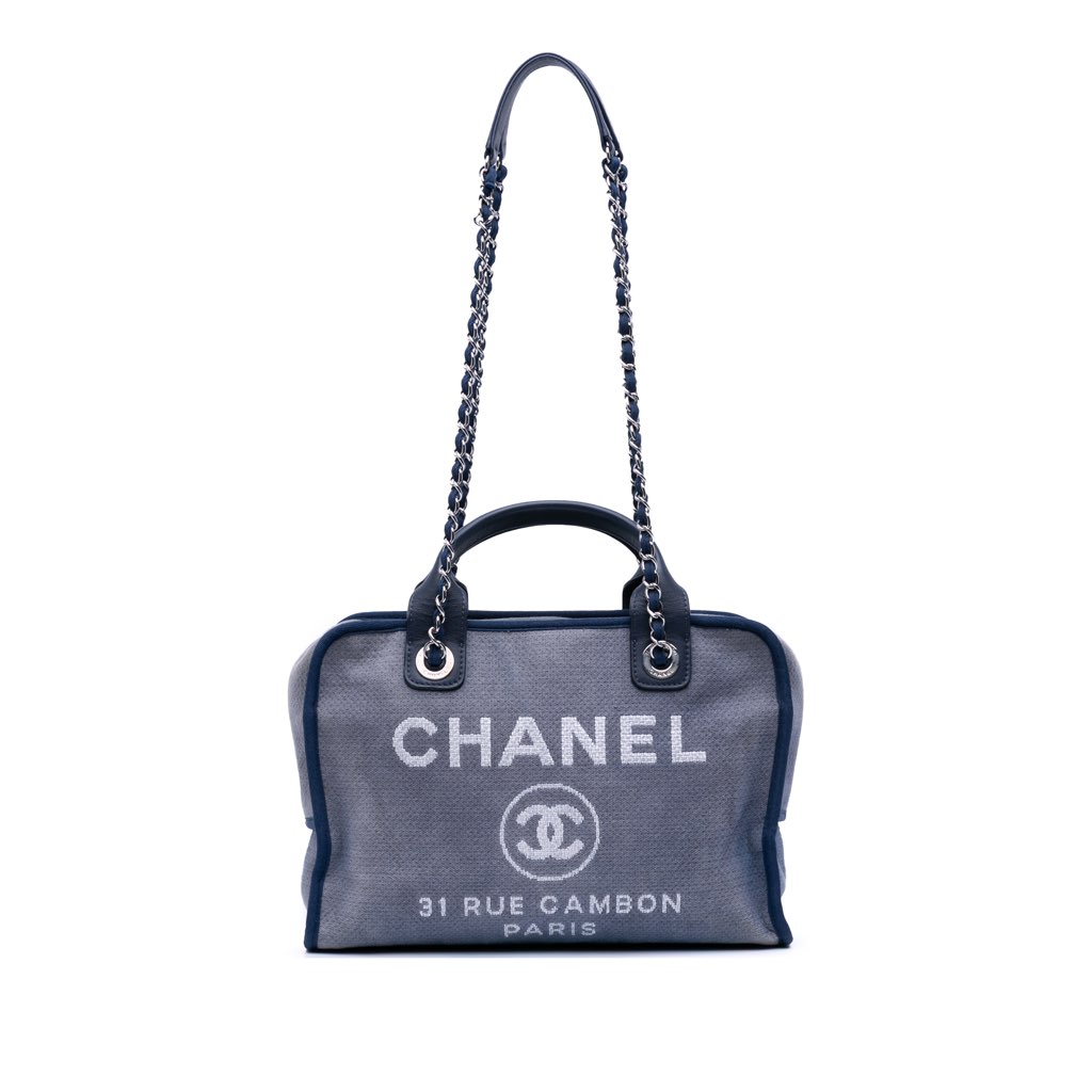 This satchel features a denim body with leather trim, flat leather handles, a leather woven chain strap with leather guard, a top zip closure, and interior zip and slip pockets.