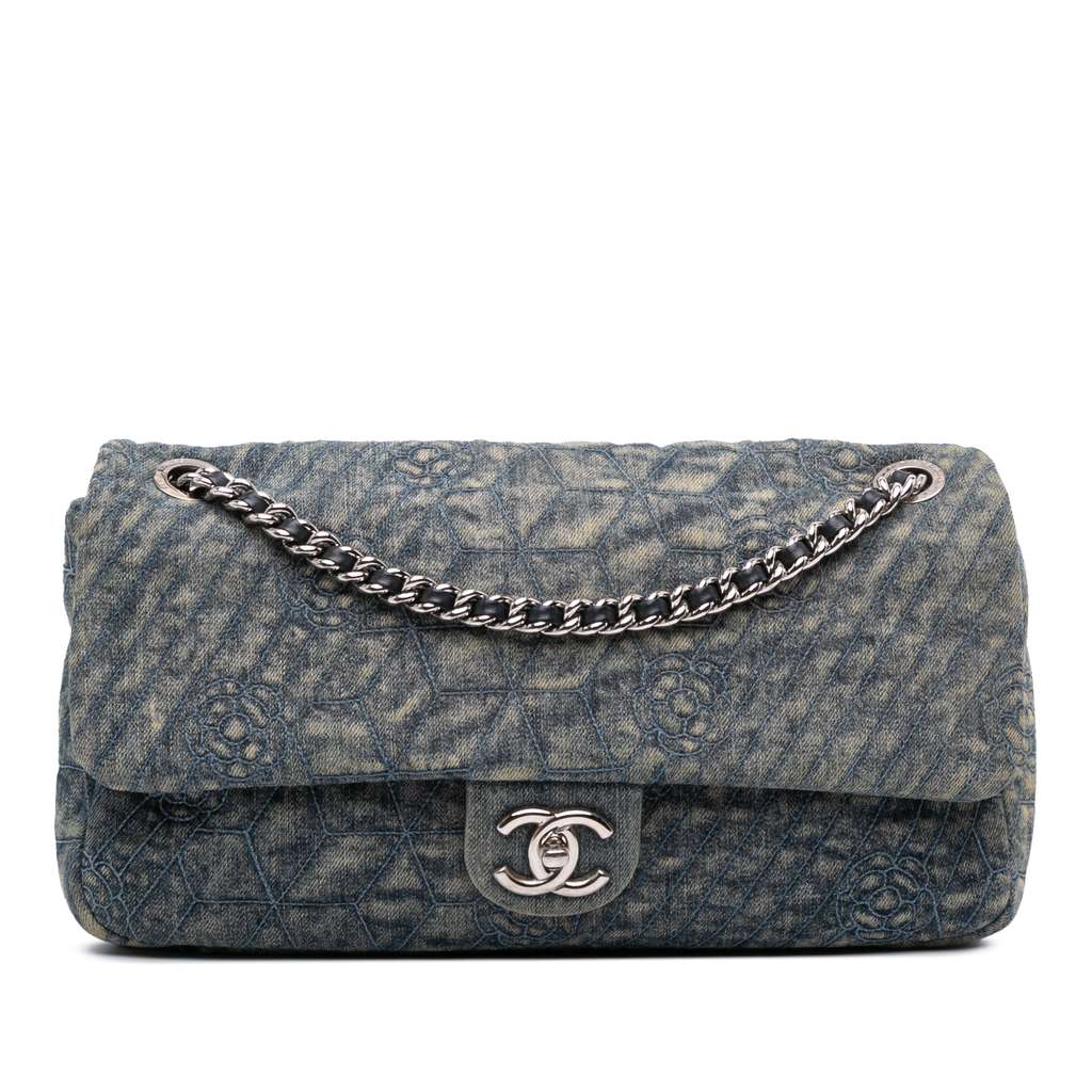 This flap bag features an embroidered denim body, a leather-woven chain strap with leather shoulder guard, a flap with CC turn lock closure, and interior zip and slip pockets.