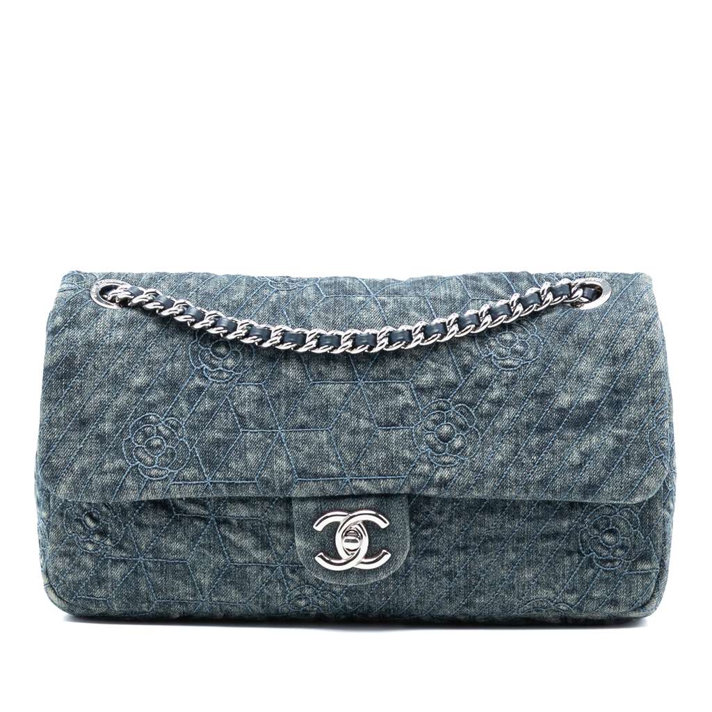This flap bag features an embroidered denim body, a leather-woven chain strap with leather shoulder guard, a flap with CC turn lock closure, and interior zip and slip pockets.