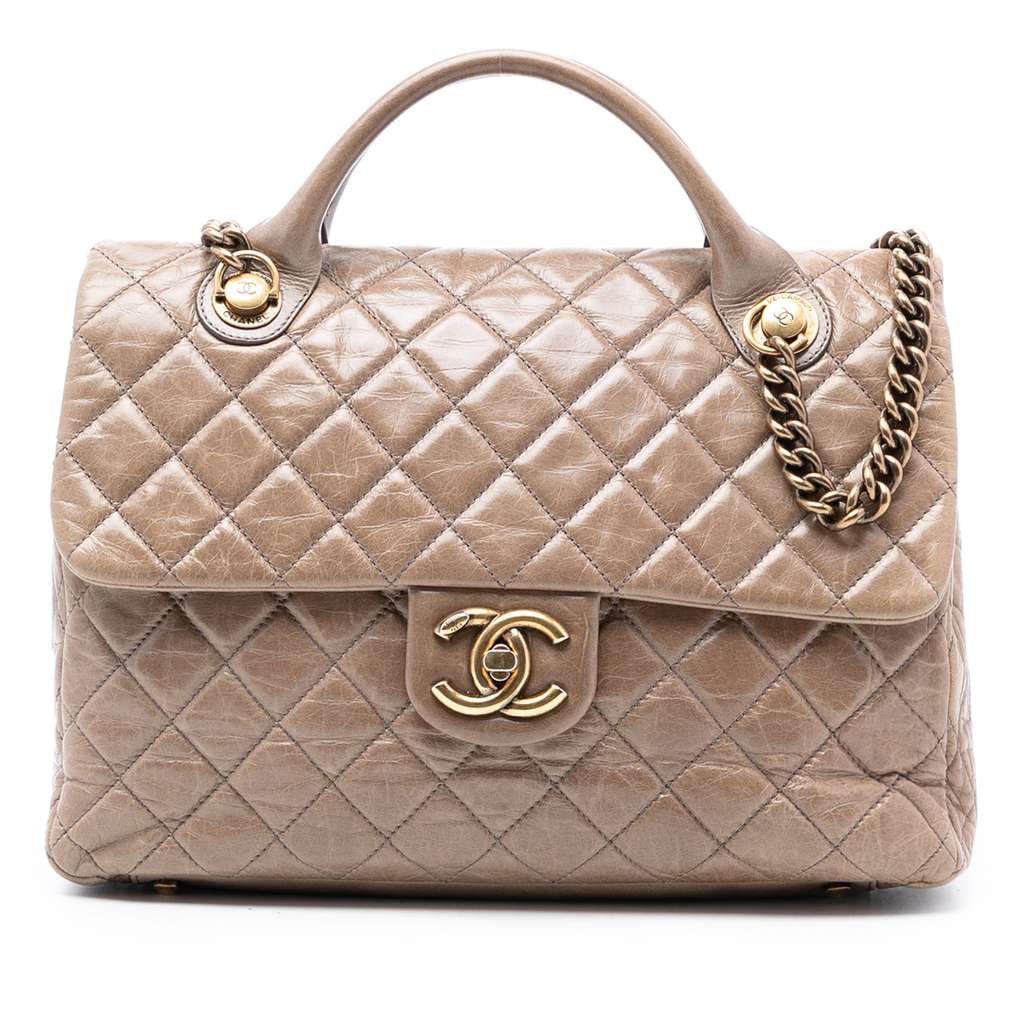 This satchel features a quilted leather body, rolled top handles, a gold-tone curb chain link straps with leather guards, a front flap with CC turn-lock closure, an exterior back slip pocket, and interior zip and slip pockets.