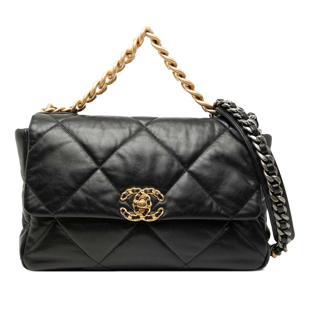 The Large 19 Flap bag features a quilted lambskin leather body, a gold-tone chain handle, a leather woven chain shoulder strap with leather guard, a flap with a CC twist lock closure, an exterior slip pocket, and an interior zip pocket.