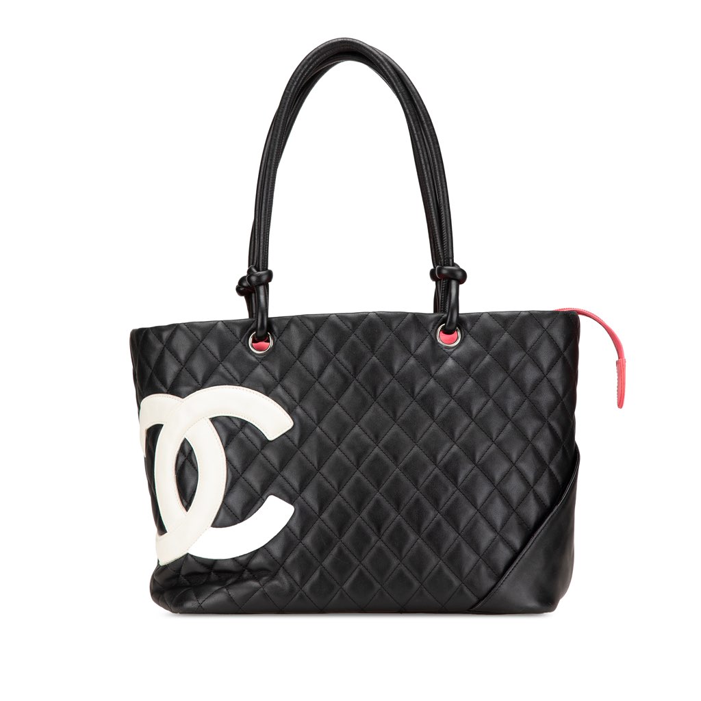 The Cambon Ligne tote features a quilted lambskin leather body, rolled leather handles, a top zip closure, an exterior back slip pocket, and interior zip and slip pockets.