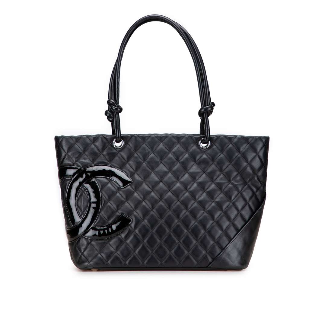 The Cambon Ligne tote bag features a quilted lambskin leather body with interlocking Cs, an exterior back slip pocket, rolled leather handles, and a top zip closure.