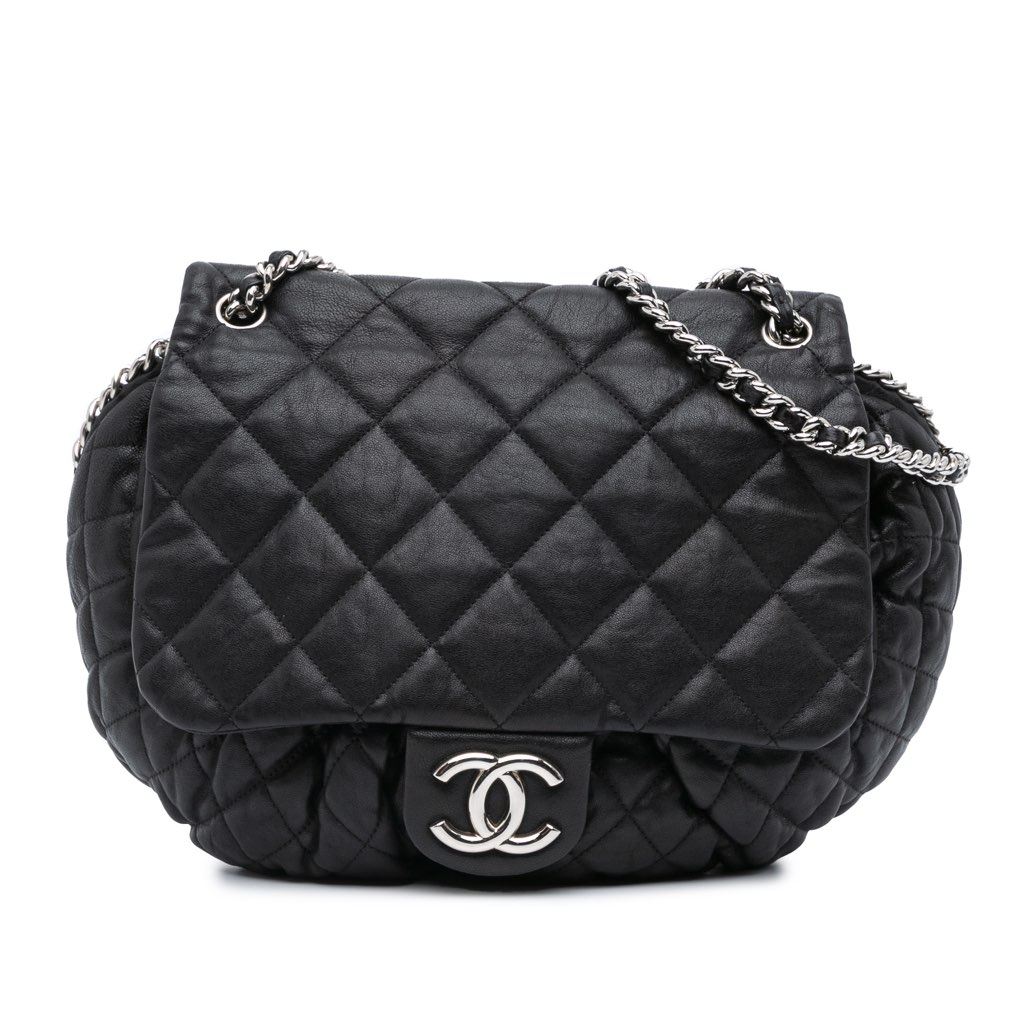The Chain Around crossbody bag features a quilted lambskin leather body, a leather-woven chain link strap, a front flap with magnetic snap closure, and interior zip and slip pockets.