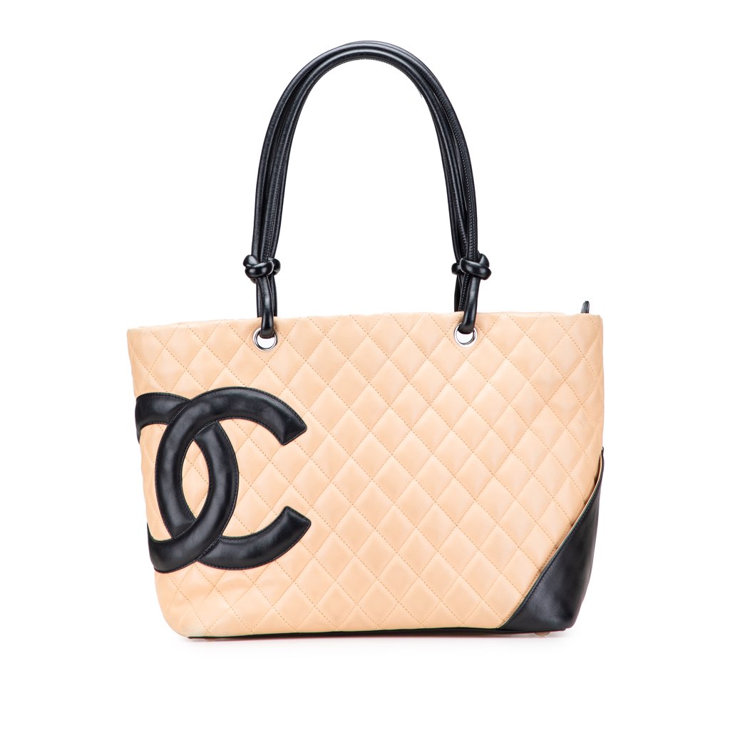 The Cambon Ligne tote features a quilted leather body, rolled leather handles, a top zip closure, an exterior back slip pocket, and interior zip and slip pockets.
