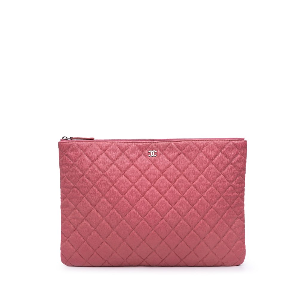 This clutch bag features a quilted caviar leather body, and a top zip closure.