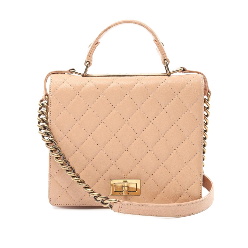 This satchel features a quilted goatskin leather body, a flat leather top handle, a chain link strap with leather guard, a front flap with turn lock closure, and an interior slip pocket.