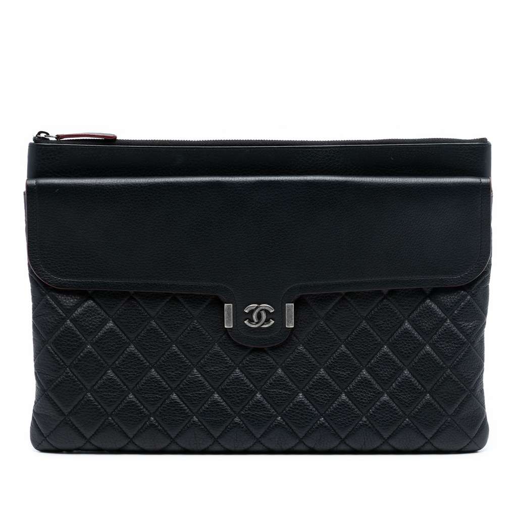 This clutch bag features a quilted leather body, a top zip closure, an exterior flap pocket, and an interior slip pocket.