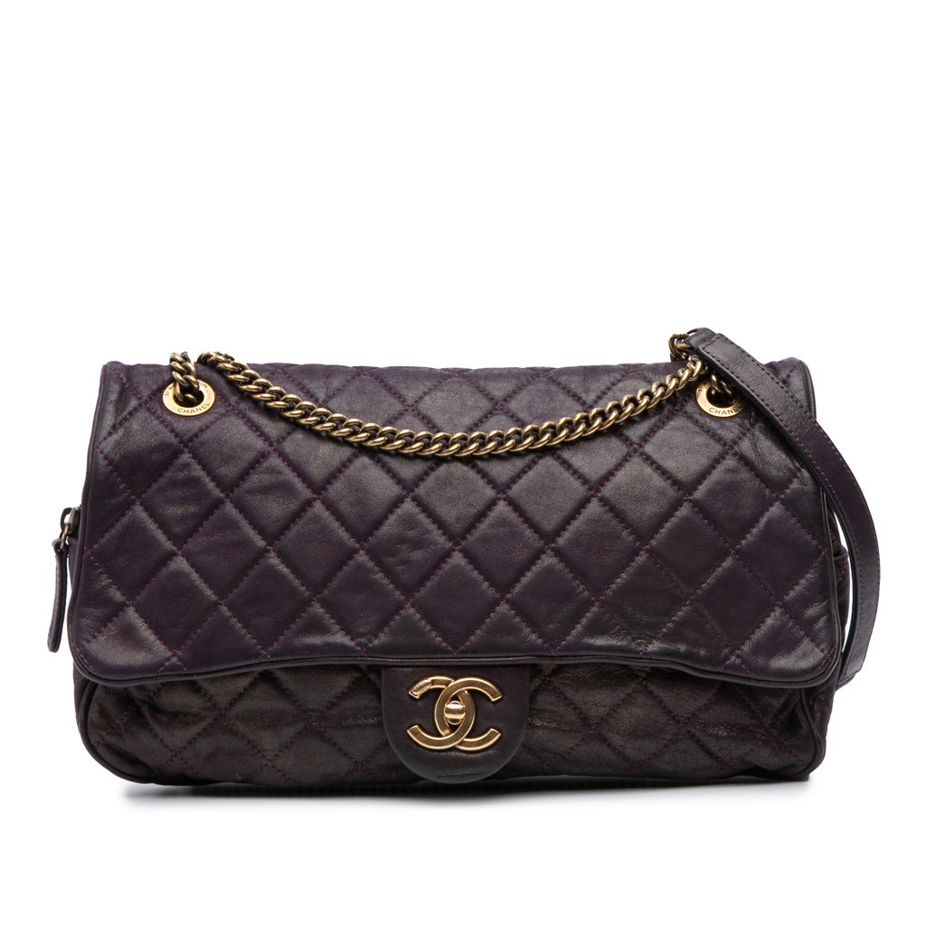 This flap bag features a quilted leather body, a chain link strap with leather shoulder guard, a front flap with CC turn lock closure, a top zip closure, and interior zip and slip pockets.