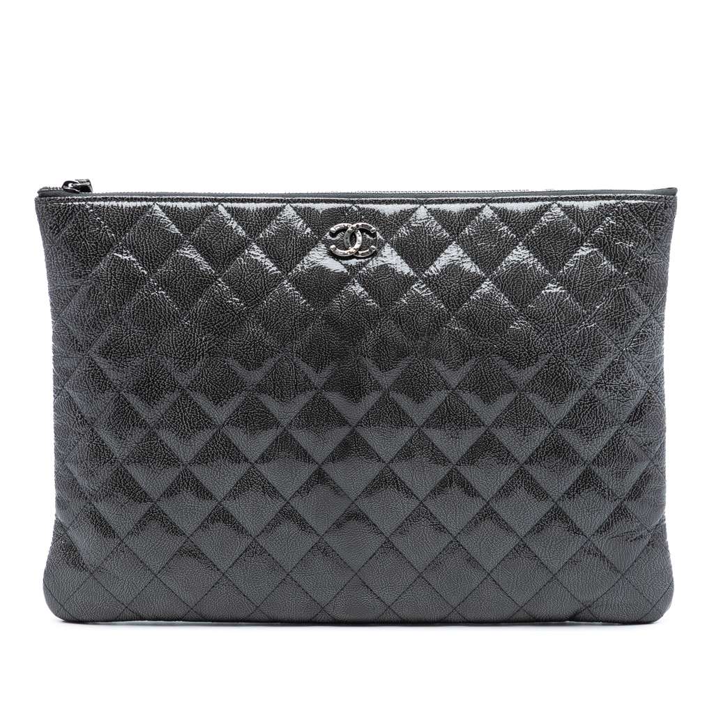 This clutch bag features a quilted patent leather body and a top zip closure.