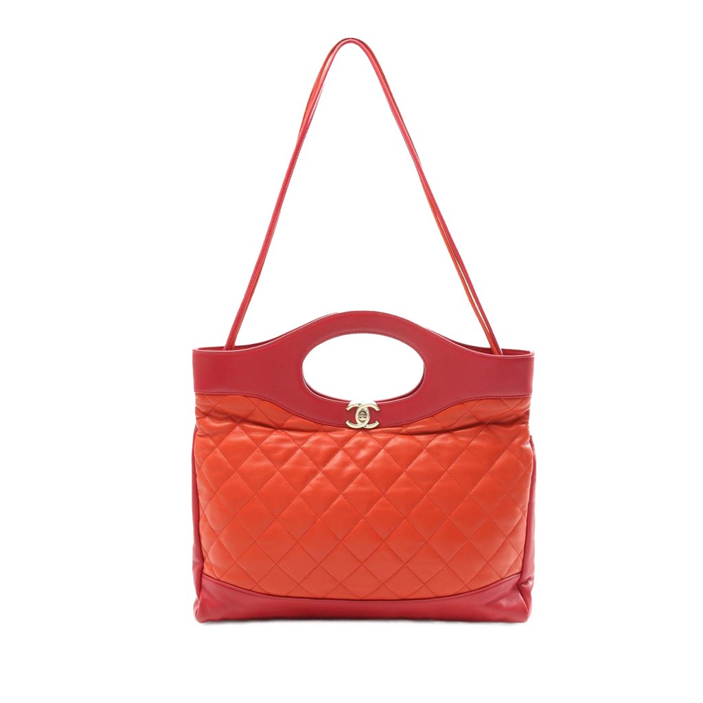 This satchel features a lambskin leather body, flat cutout handles, detachable leather straps, an open top with CC turn lock closure, and interior zip pockets.