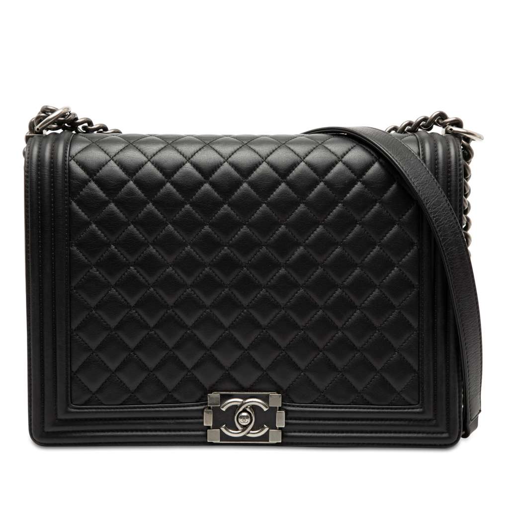 The Large Boy Flap Bag features a quilted lambskin leather body, a flat leather strap with chain in silver-tone hardware, a front flap with interlocking Cs and push lock closure, and interior zip and slip pockets.