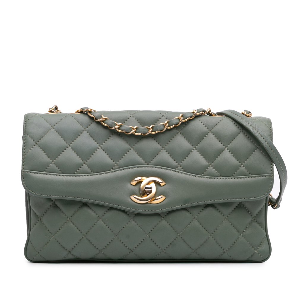 The Daily Companion flap bag features a quilted lambskin leather body, a leather-woven chain link shoulder strap with leather guard, a front flap with interlocking Cs and twist lock closure, an exterior back slip pocket, and interior zip and slip pockets.