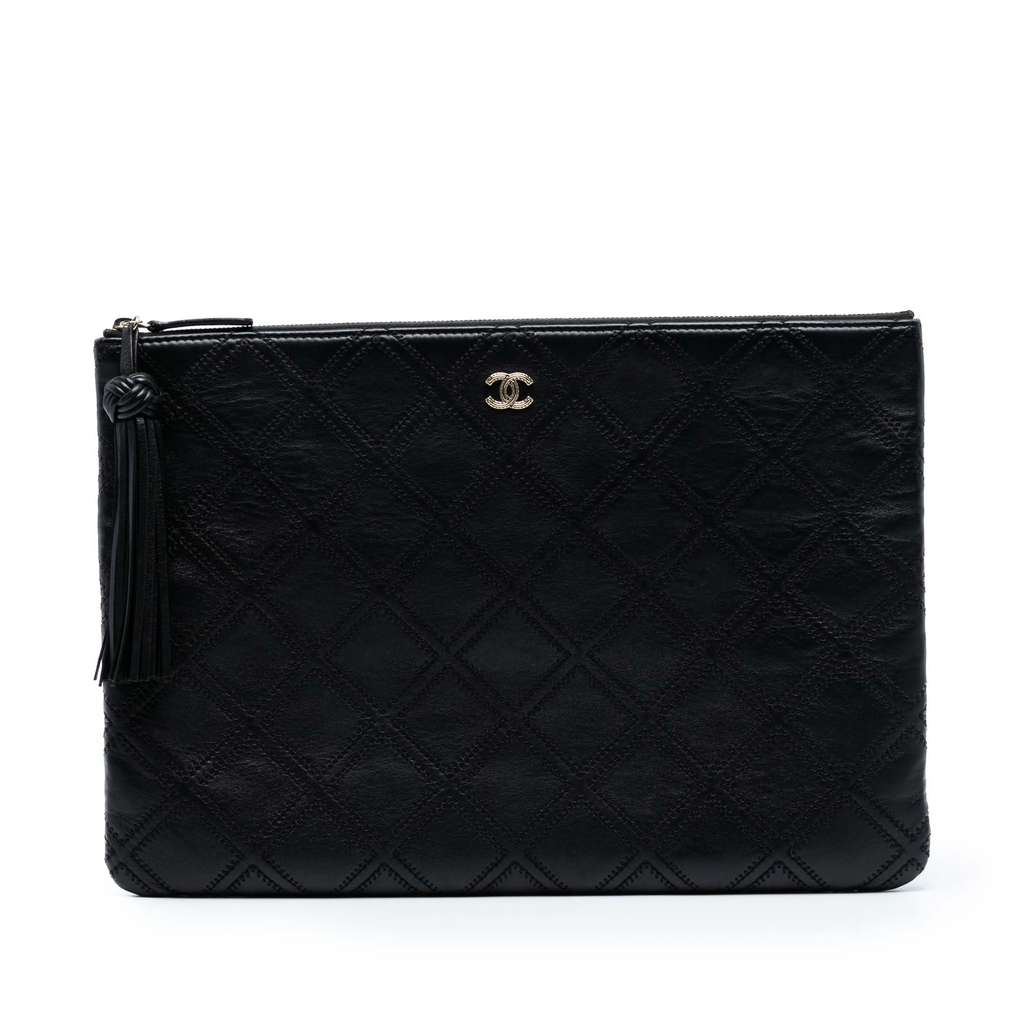 This clutch bag features a quilted lambskin leather body, a top zip closure, and a tassel.