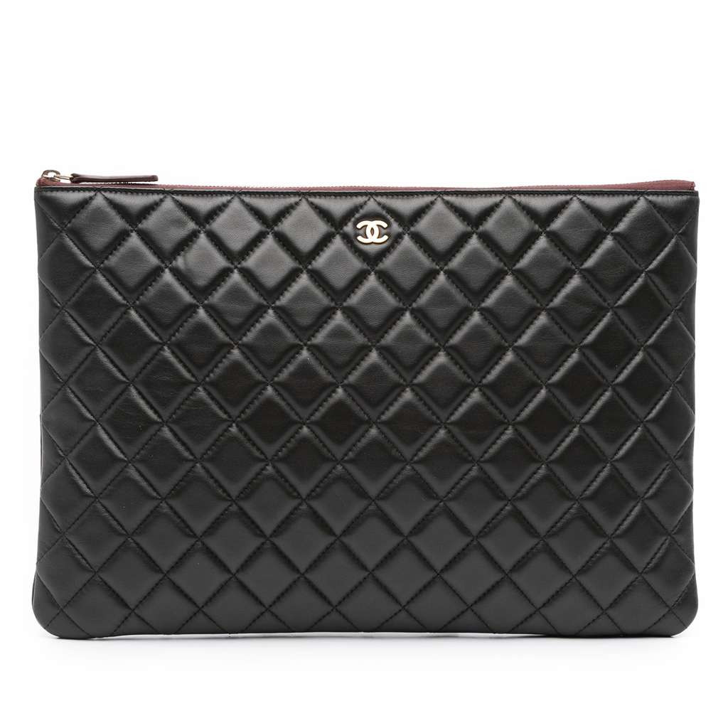 This clutch features a quilted lambskin leather body and a top zip closure.
