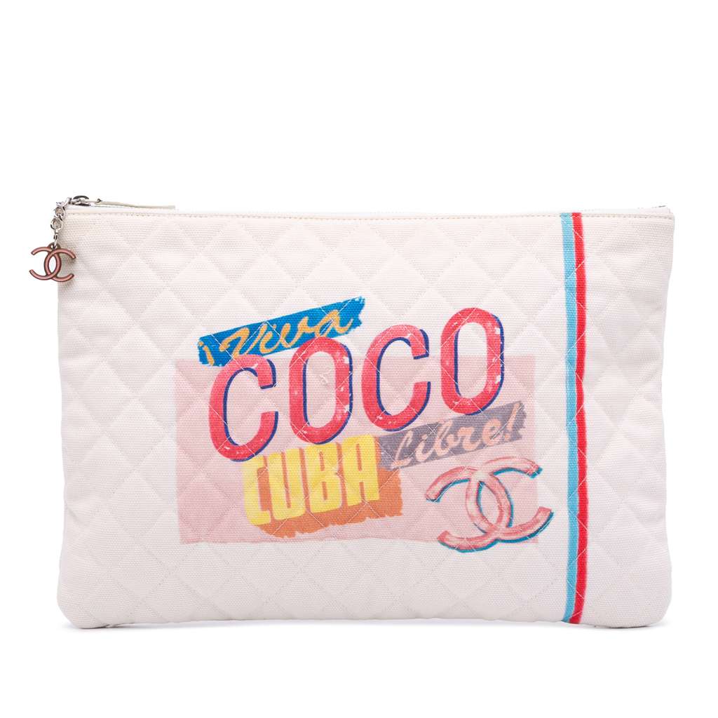 This clutch bag features a printed quilted canvas body, and a top zip closure.