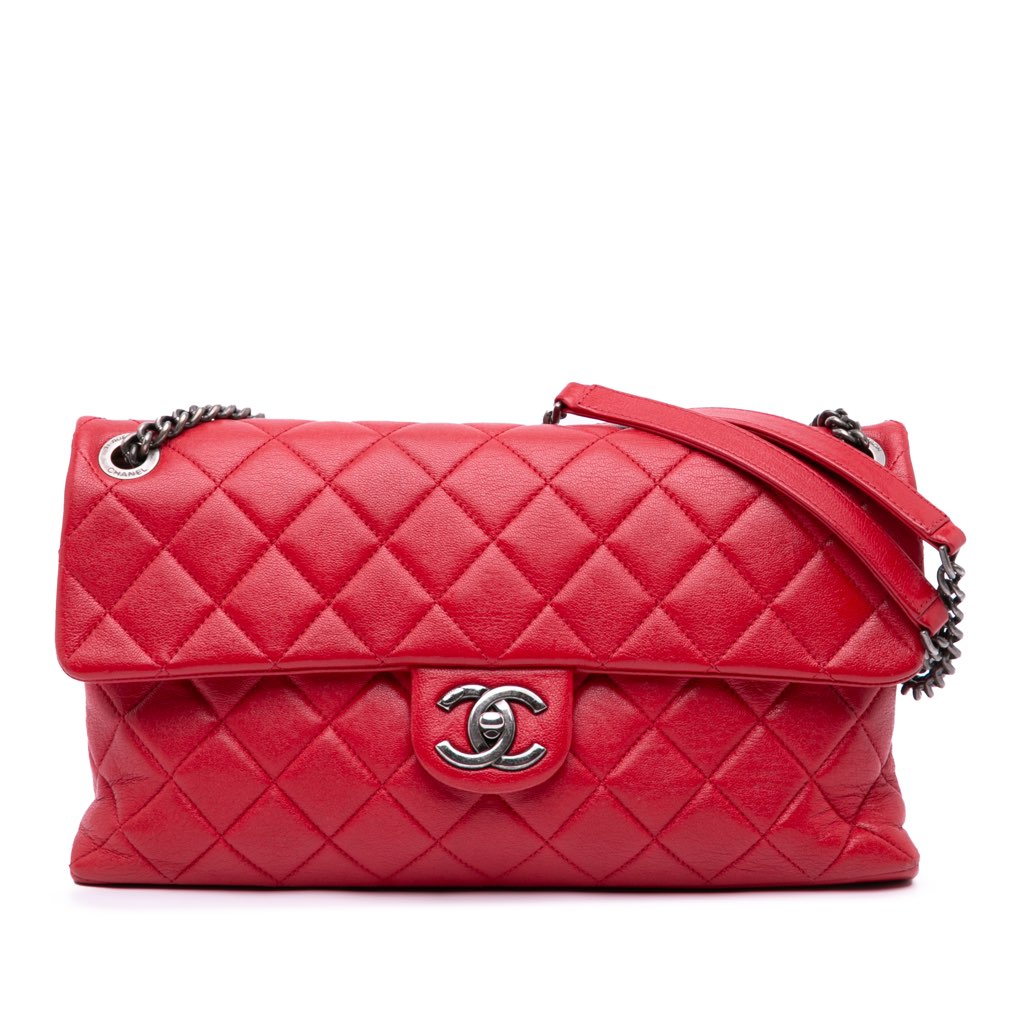 This shoulder bag features a leather body, chain link straps with leather guard, a front flap with CC turn lock closure, and interior zip and slip pockets.