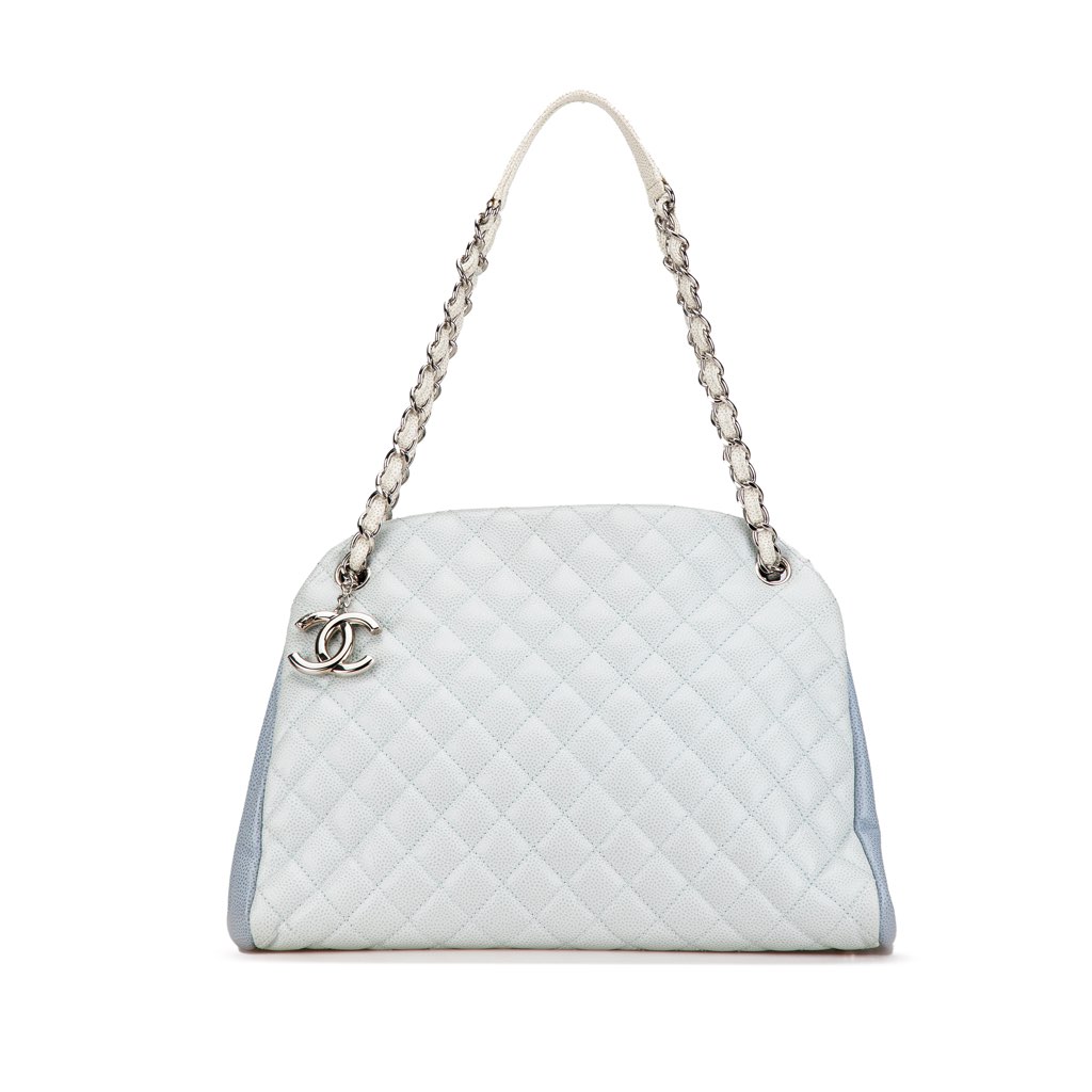 The Just Mademoiselle features a quilted caviar leather body, leather-woven chain straps, an open top with magnetic snap closure, an interior zip compartment, and interior zip and slip pockets.