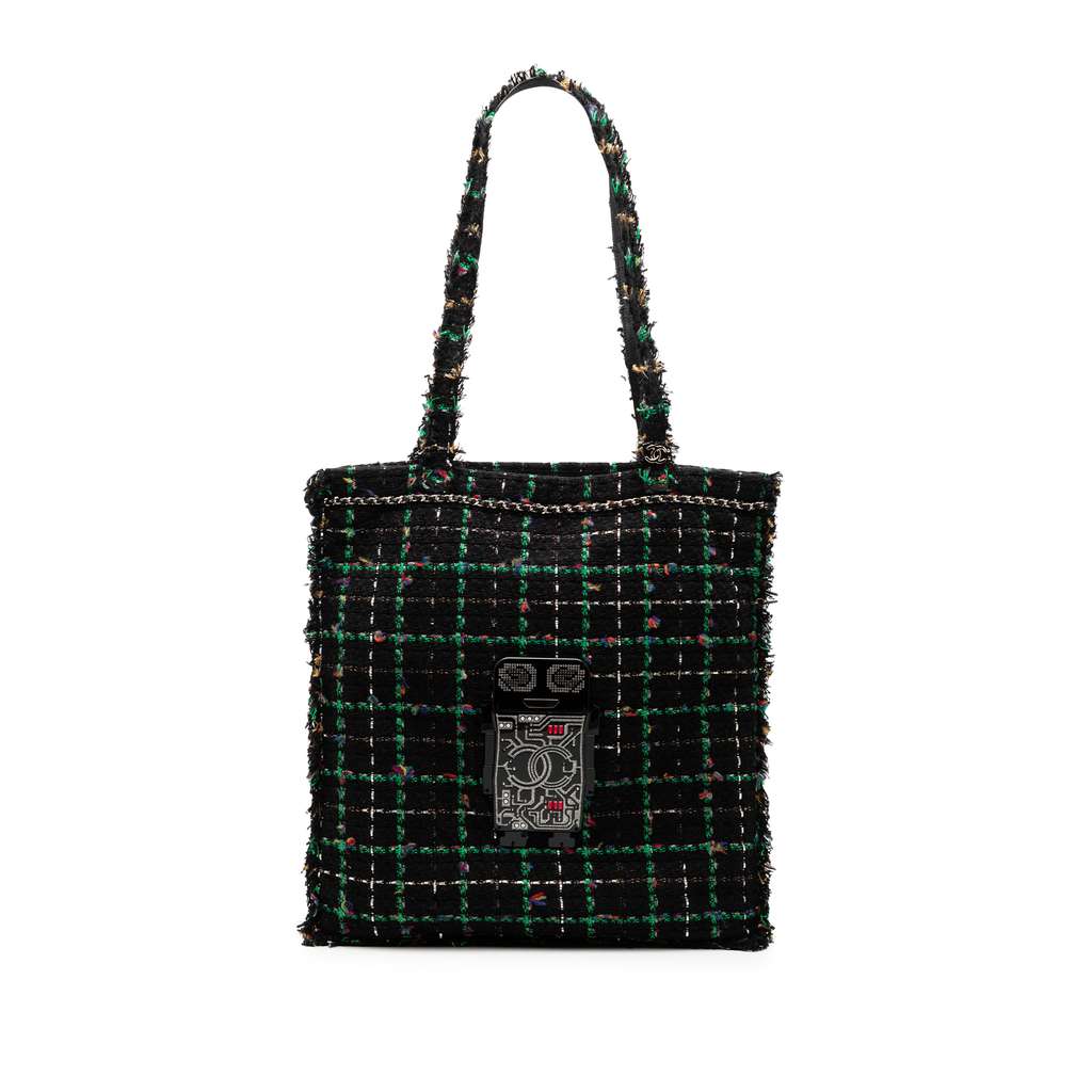This tote bag features a tweed body, flat shoulder straps, an open top, and an interior slip pocket.