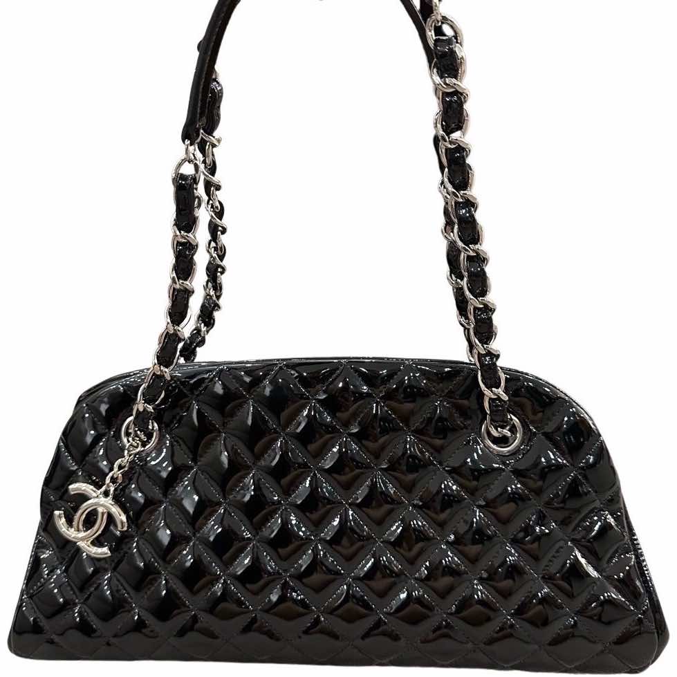 Patent black quilted leather bag with CC charm and woven chain and leather handles