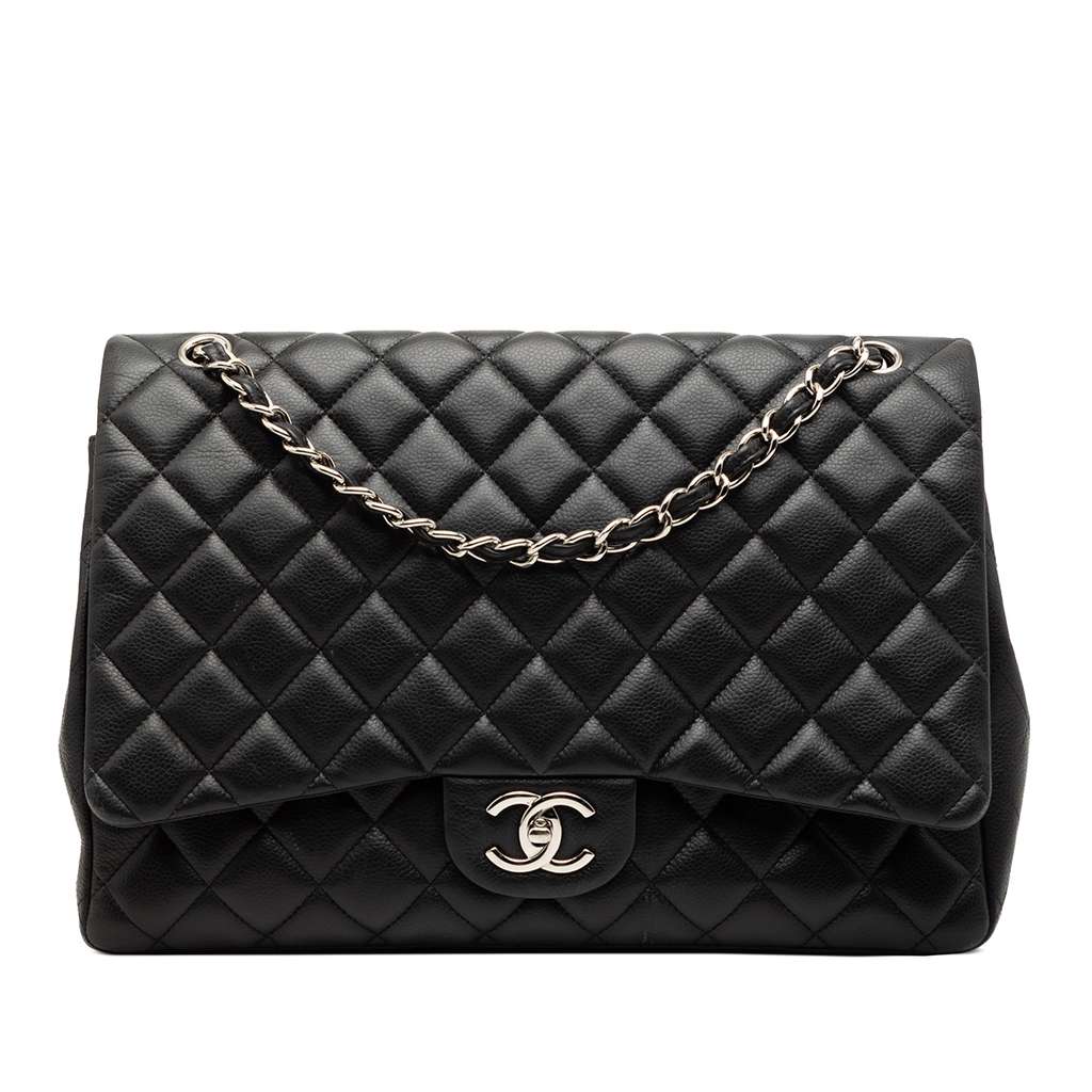 The Classic Maxi features a quilted caviar leather body, leather-woven chain straps, double front flaps with interlocking Cs and a twist lock closure, an exterior back slip pocket, and interior zip and slip pockets.
