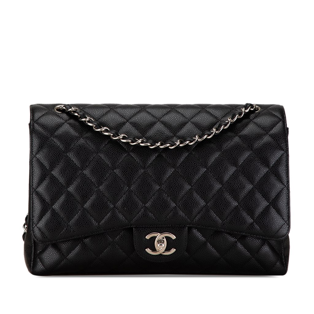 The Classic Maxi features a quilted caviar leather body, leather-woven chain link straps, double front flaps with interlocking Cs and a twist lock closure, an exterior back slip pocket, and interior slip pockets.