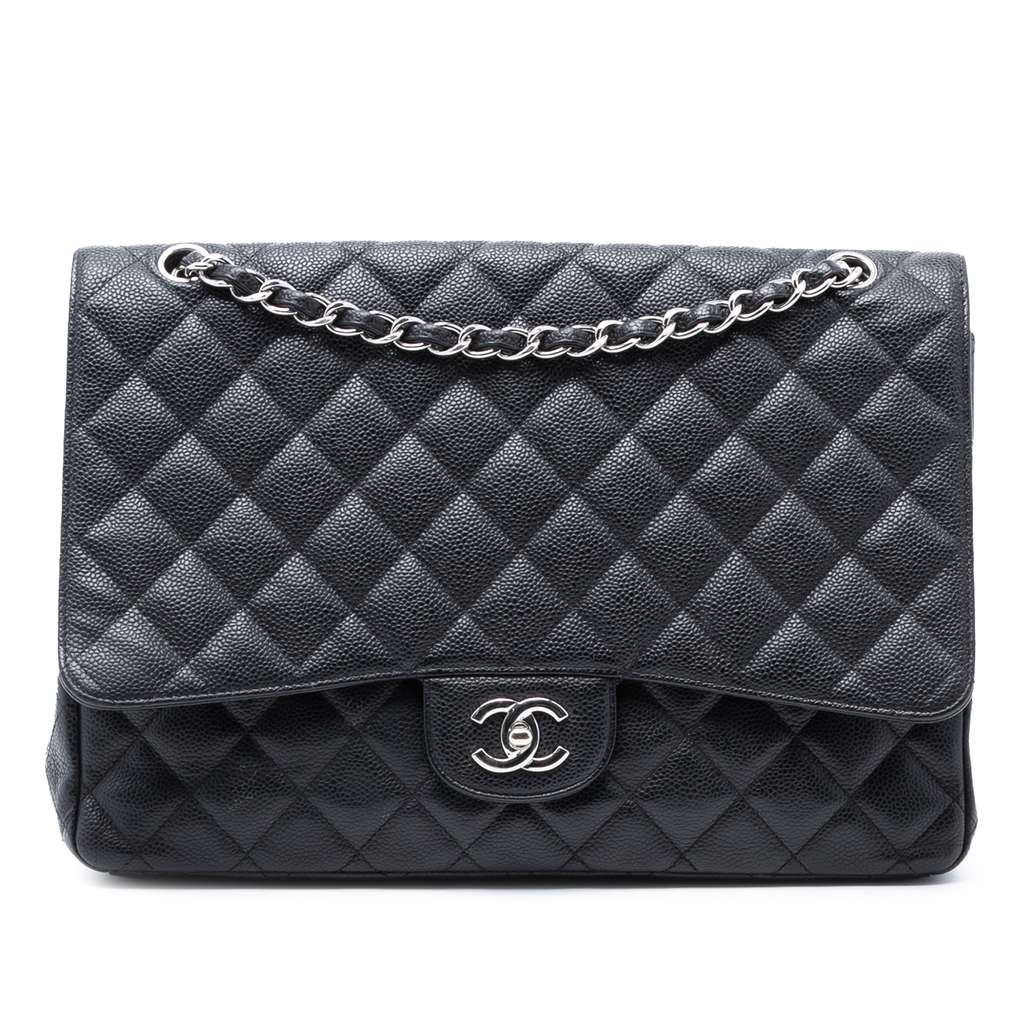 This shoulder bag features a quilted caviar leather body, leather woven chain link straps, a top flap with CC turn lock closure, an exterior back slip pocket, and interior zip and slip pockets. Exterior corners are repainted.