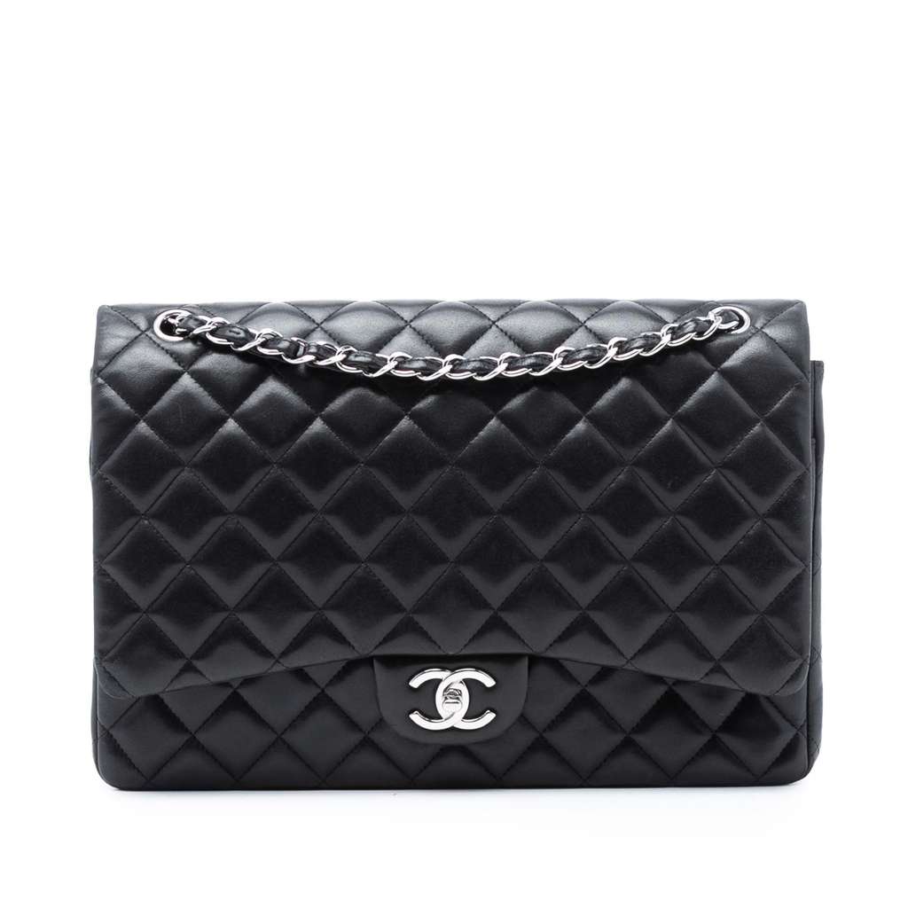 This shoulder bag features a quilted lambskin leather body, leather woven chain straps, double front flaps with interlocking Cs and a twist lock closure, an exterior back slip pocket, and interior zip and slip pockets.