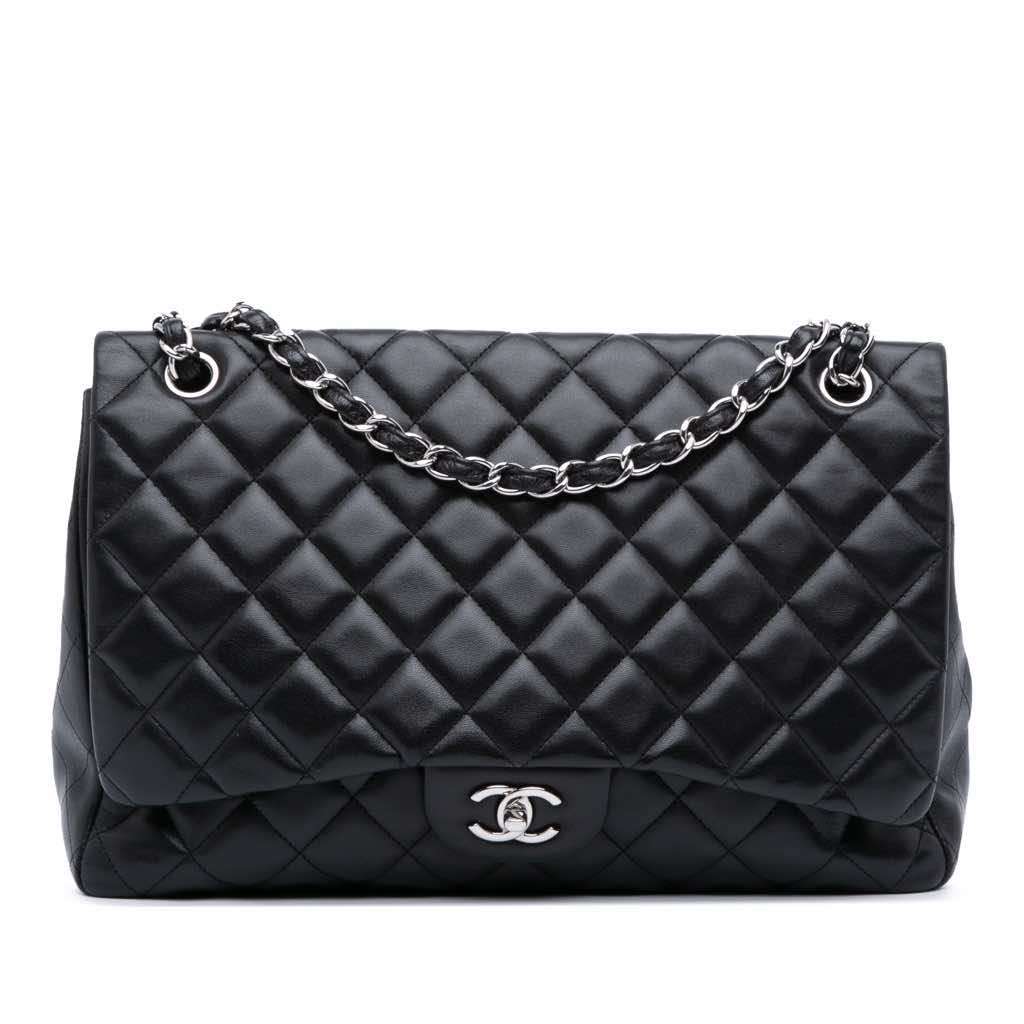 This shoulder bag features a quilted lambskin body, leather-woven chain shoulder straps, a front flap with interlocking Cs and a twist lock closure, an exterior back slip pocket, and interior zip and slip pockets.