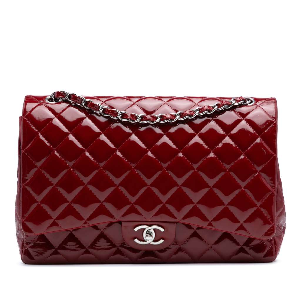 This shoulder bag features a quilted patent leather body, leather-woven chain straps, double front flaps with interlocking CC twist lock closure, an exterior back slip pocket, and interior zip and slip pockets.