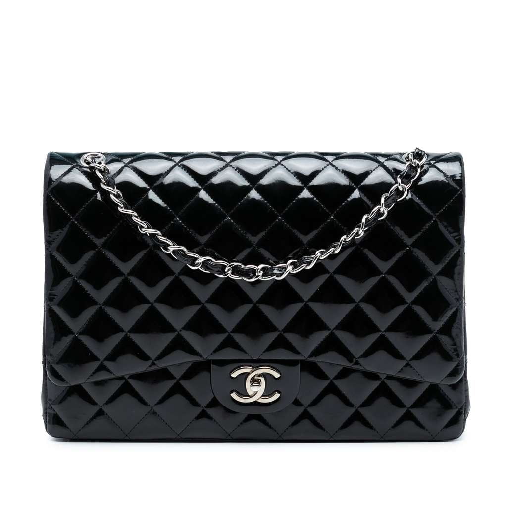 This shoulder bag features a quilted patent leather body, leather-woven chain straps, double front flaps with interlocking CC twist lock closure, an exterior back slip pocket, and interior zip and slip pockets.