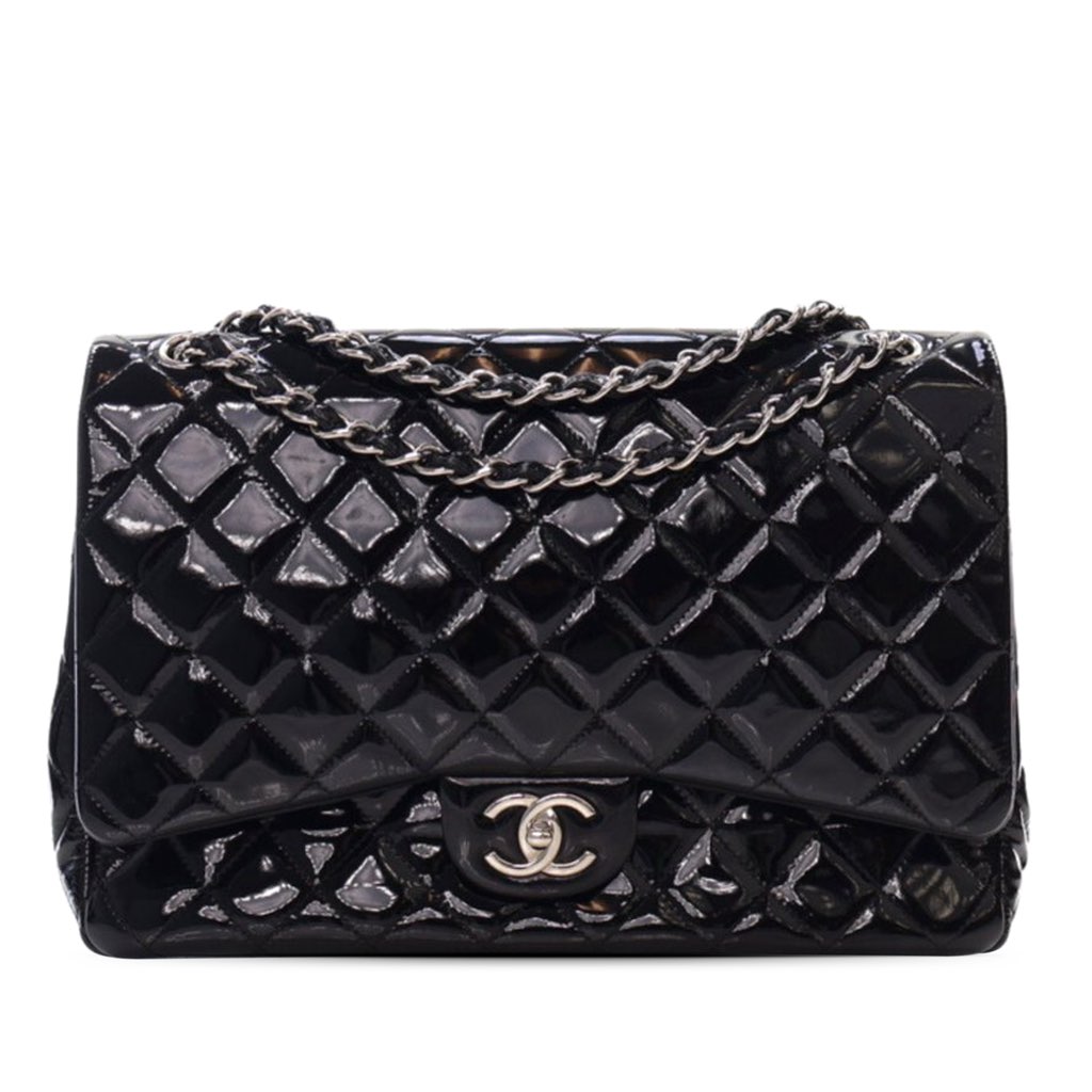This shoulder bag features a quilted patent leather body, leather-woven chain straps, double front flaps with interlocking CC twist lock closure, an exterior back slip pocket, and interior zip and slip pockets.