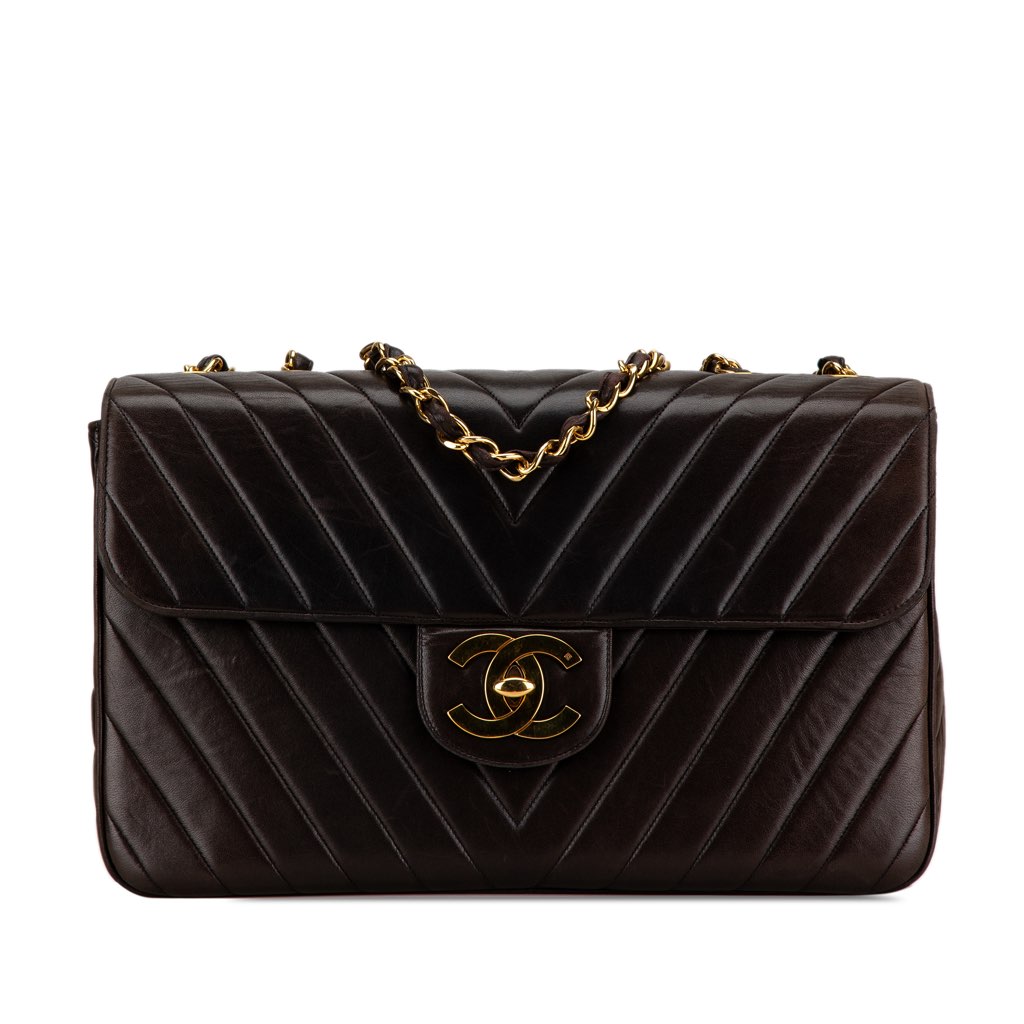 This flap bag features a quilted lambskin leather body, leather-woven chain straps, a front flap with CC turn lock closure, an exterior back slip pocket, and interior zip and slip pockets.