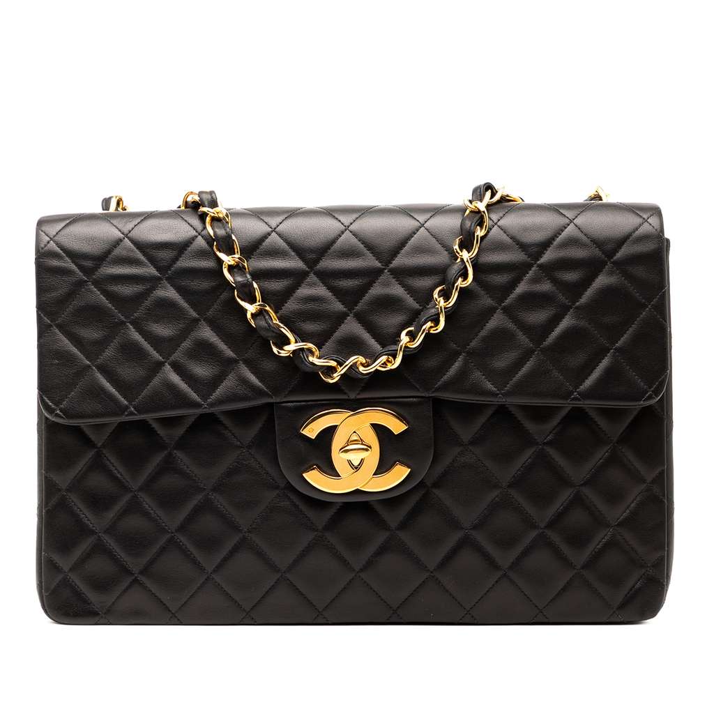 This flap bag features a lambskin leather body, leather woven chain straps, a front flap with an oversize CC turn lock closure, a back exterior slip pocket, and interior zip and slip pockets.