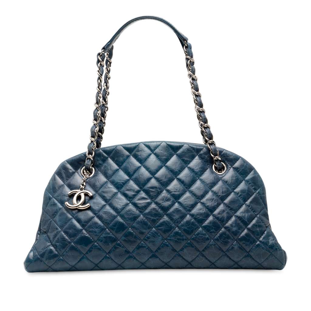This shoulder bag features a quilted aged calfskin body, leather woven chain link straps with leather shoulder guards, an open top, an interior compartment with kiss lock closure, and interior zip and slip pockets.