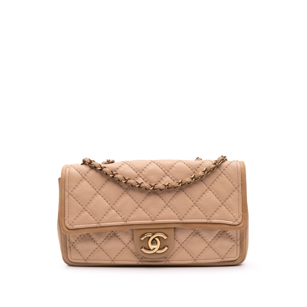 This shoulder bag features a quilted calfskin leather body, leather woven chain link straps, a front flap with turn lock closure, and an interior zip pocket.