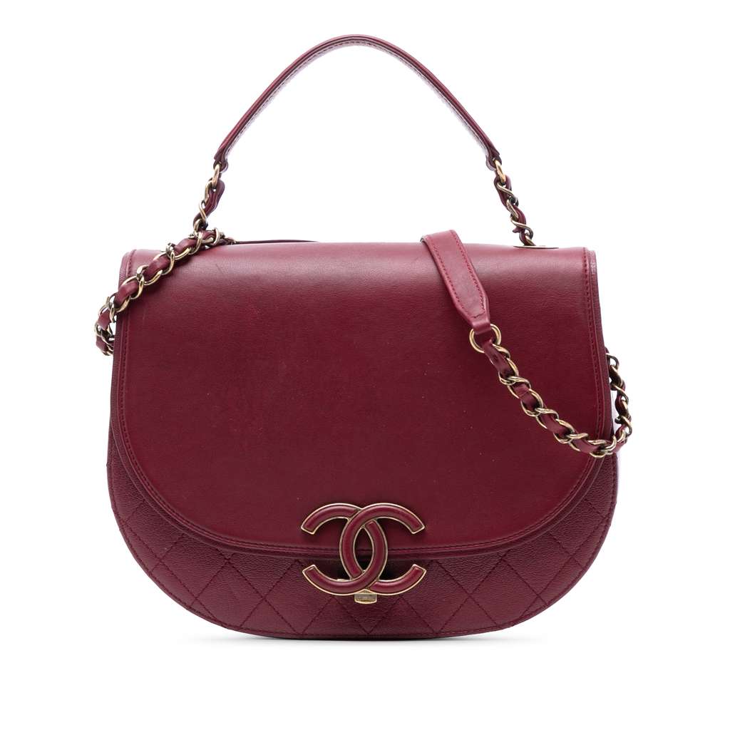 The Medium Coco Curve bag features a leather body, a flat leather top handle, a leather woven chain shoulder strap with leather guard, a front flap with a push-lock closure, an exterior zip pocket, and interior zip and slip pockets.