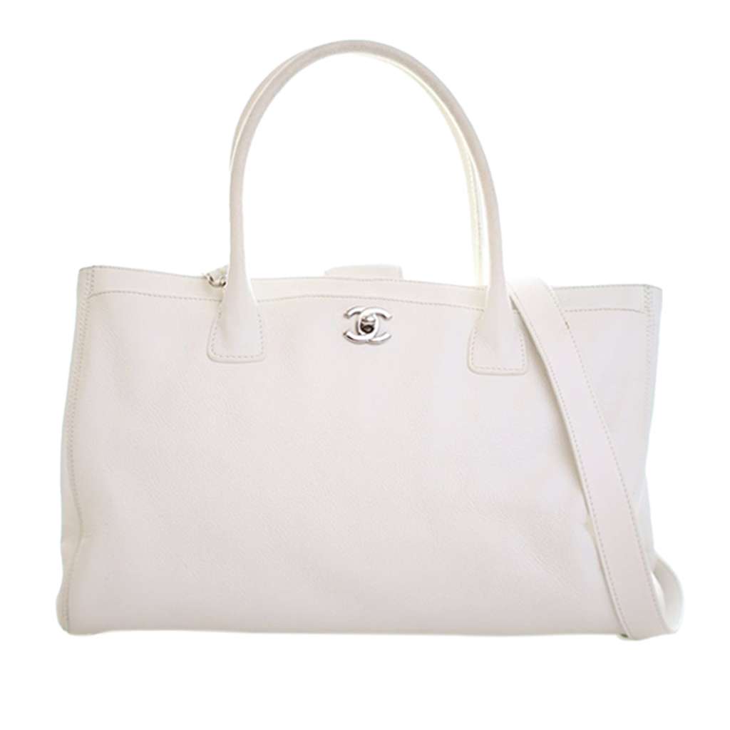 The Cerf Tote features a leather body, rolled leather handles, a detachable flat leather strap, a top strap with interlocking Cs and twist lock closure, exterior slip pockets, and an interior zip pocket.