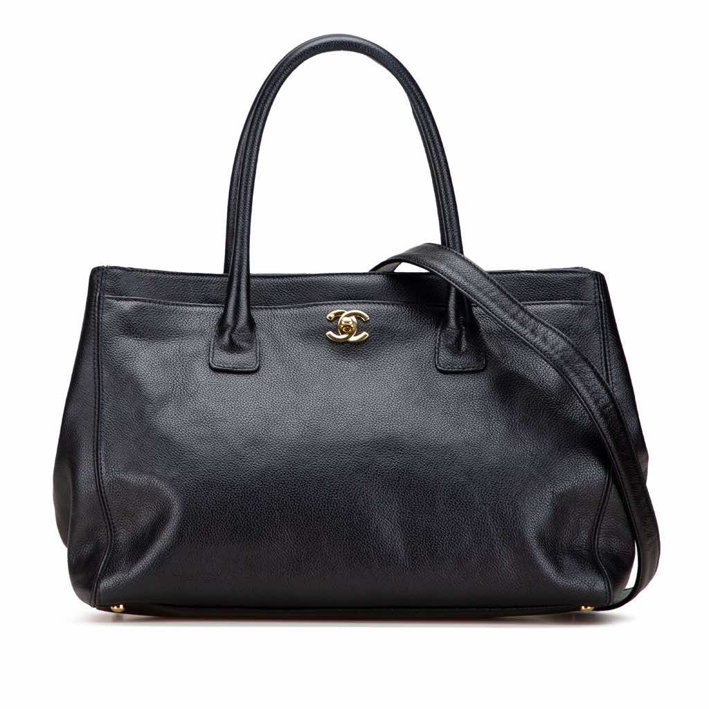 The Cerf Tote features a leather body, rolled leather handles, a detachable flat leather strap, a top strap with interlocking Cs and twist lock closure, exterior slip pockets, and an interior zip pocket.