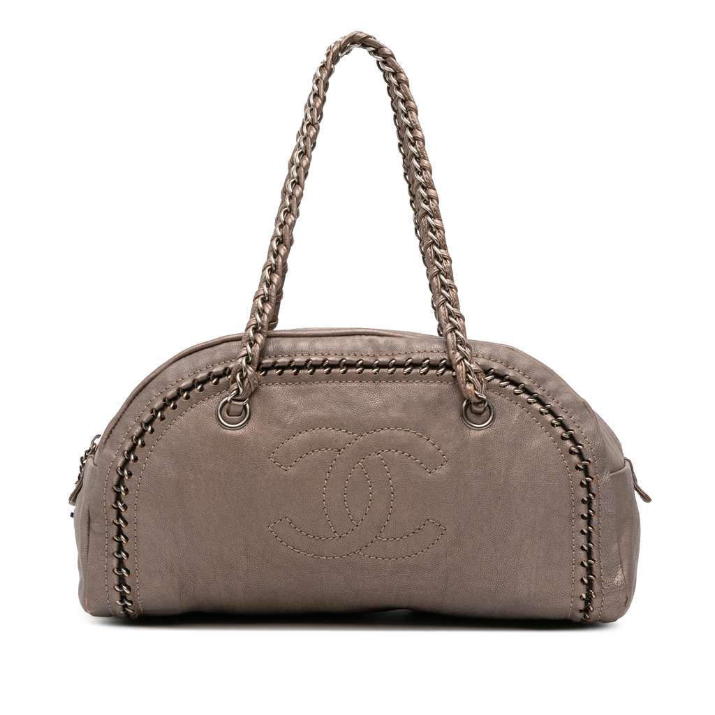 This handbag features a calfskin leather body, silver-tone hardware, leather woven chain link handles, a top zip closure, and interior zip and slip pockets.