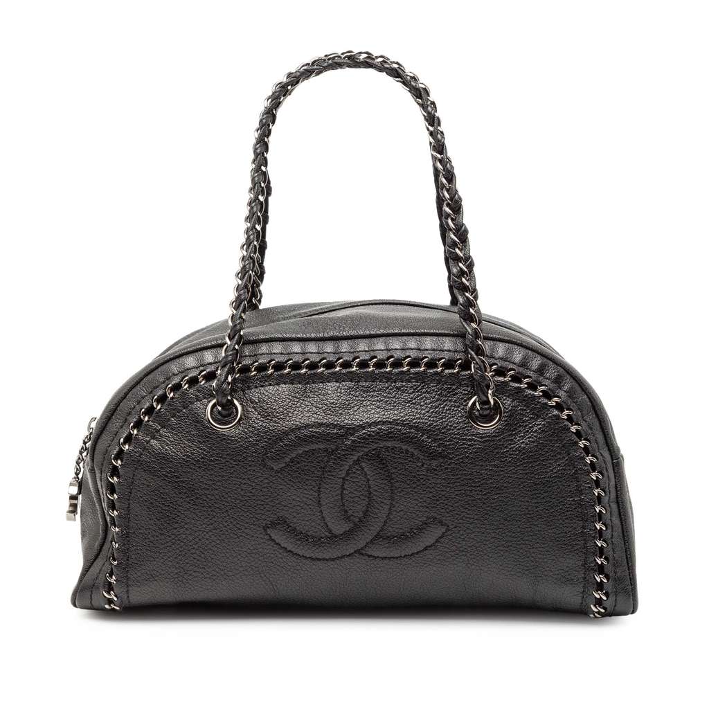This handbag features a calfskin leather body, leather woven chain handles, a top zip closure, and an interior zip pocket.