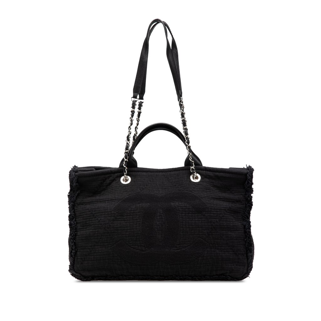 The CC Double Face Deauville features a canvas body with cotton trim, a flat top leather handle, a leather woven chain link strap with leather guard, an open top with a snap closure, and interior zip and slip pockets.