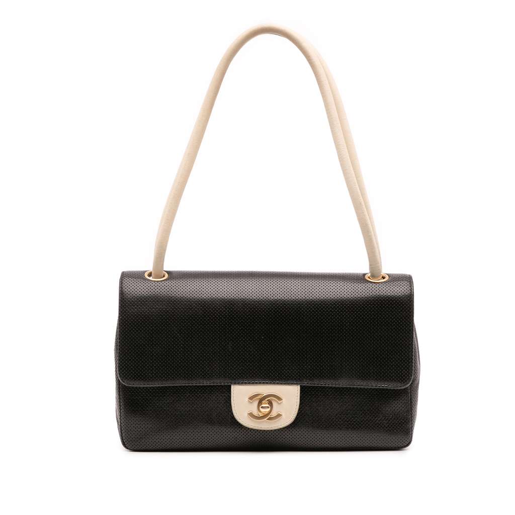 This shoulder bag features a perforated calf leather body, rolled leather shoulder straps, a front flap with a CC turn-lock closure, an exterior back slip pocket, and an interior zip pocket.