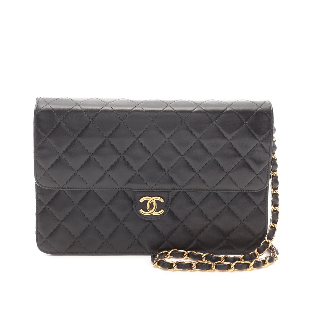 This crossbody bag features a quilted lambskin leather body, a leather woven chain strap, a front flap with CC turn lock closure, and interior zip pocket and slip pockets.