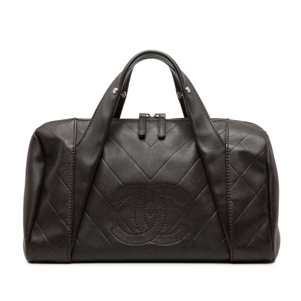 This boston bag features a quilted lambskin leather, flat leather straps with silver hardware, top zip closure, and interior zip and slip pockets.