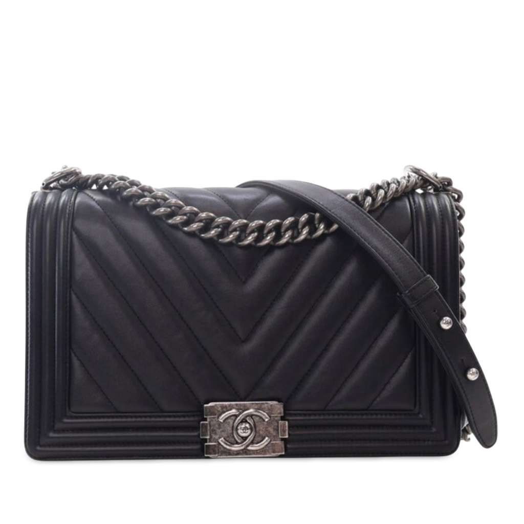 The Boy Flap features a quilted lambskin leather body, a chain and leather shoulder strap, a front flap with interlocking Cs and push lock closure, and interior zip and slip pockets.
